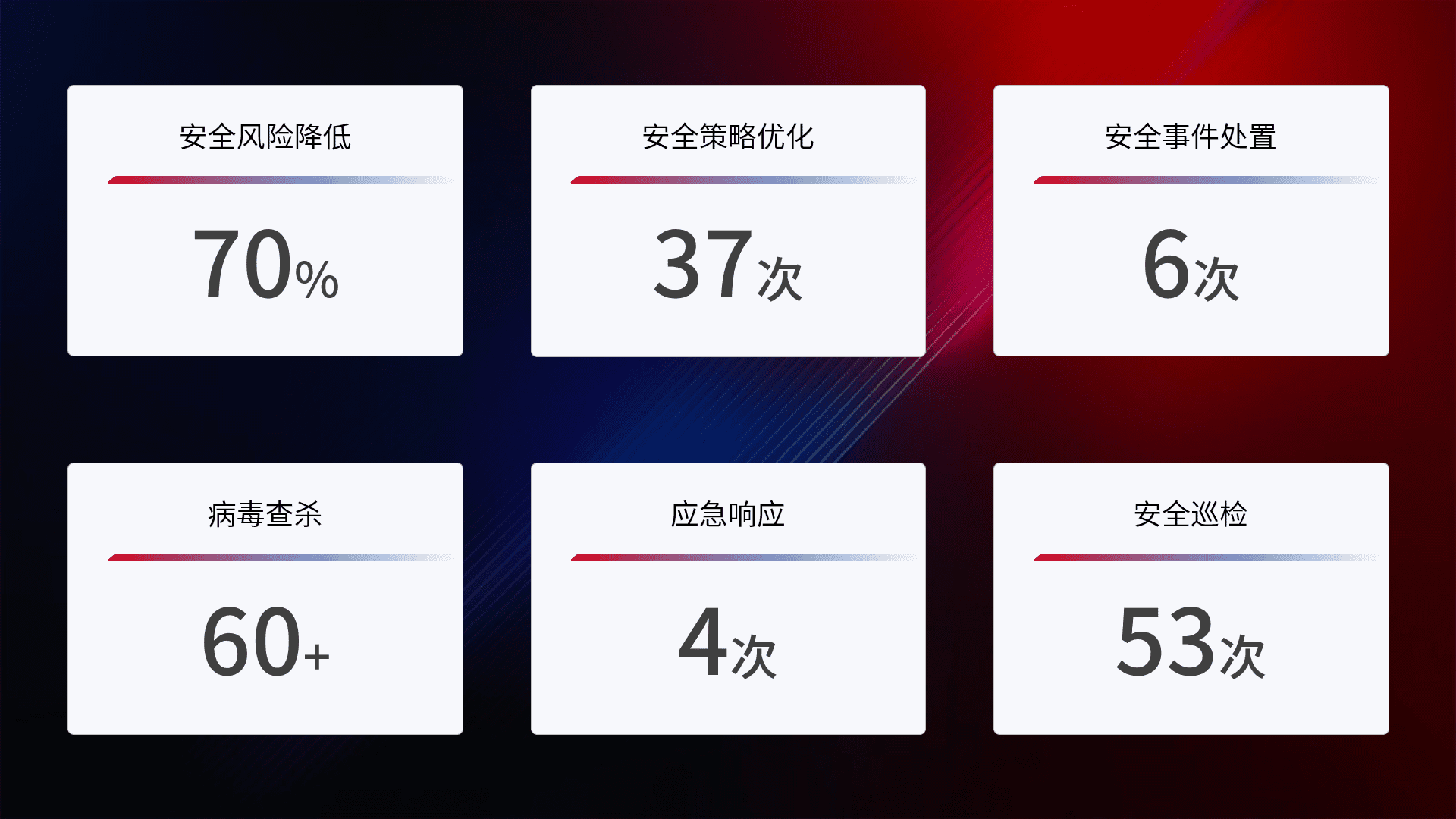 提供全面的安全事件报告体系,,包括处置报告、、、周报、、季度和年度总结,,,,结合持续监控,,,,帮助客户深入了解网络安全状况。。。。