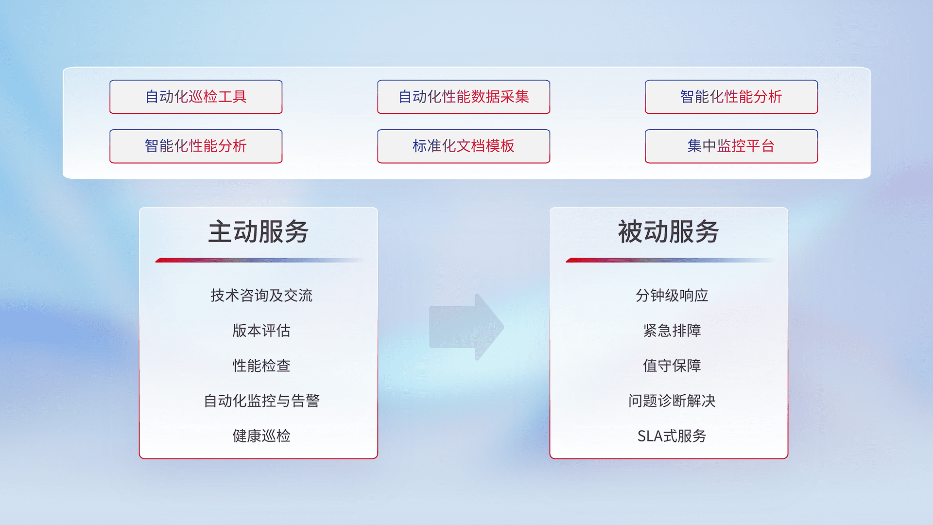 智能化工具和标准化文档,,,,保障服务质量,,提供主动服务(包含技术咨询、、、版本评估、、、、性能检查、、、、自动化监控与告警、、健康巡检)和被动服务包含(分钟级响应、、、紧急排障、、值守保障、、问题诊断解决、、、SLA服务)。。